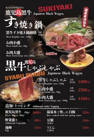 | Lunch ランチメニュー 黒豚しゃぶしゃぶ御膳 1280円〜1980円(税込) ![]() 黒牛すき焼き鍋御膳 2800円〜4400円(税込) ![]() |